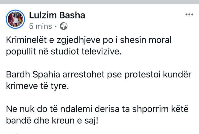 Sipas Bashës, kriminelët e zgjedhjeve po shesin moral në studiot televizive dhe se Spahia u arrestua sepse protestoi kundër këtyre krimeve.