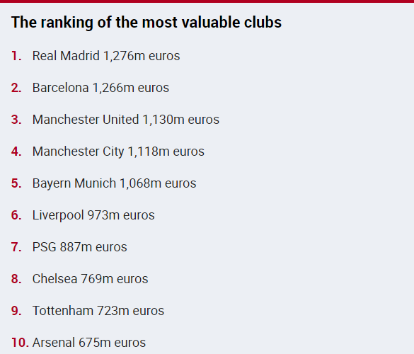 Në top pesëshe me vlerën mbi 1 miliard euro janë edhe klubet si Manchester United, Manchester City dhe Bayern Munich.