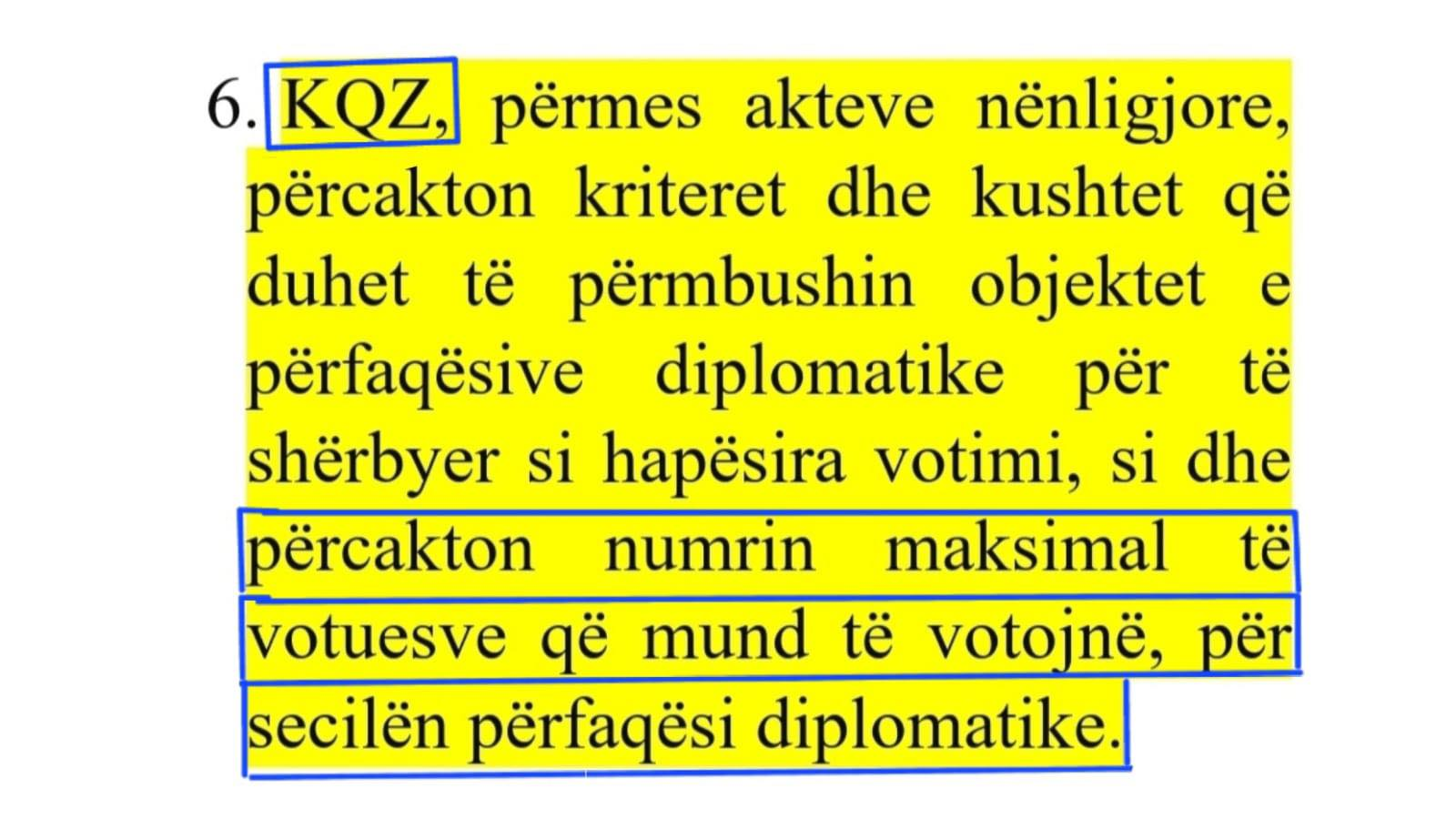 “KQZ, përmes akteve nënligjore, përcakton kriteret dhe kushtet që duhet të përmbushin objektet e përfaqësive diplomatike për të shërbyer si hapësira votimi, si dhe përcakton numrin maksimal të votuesve që mund të votojnë, për secilën përfaqësi diplomatike”, specifikohet në pikën 6 të nenit 96 për votimin