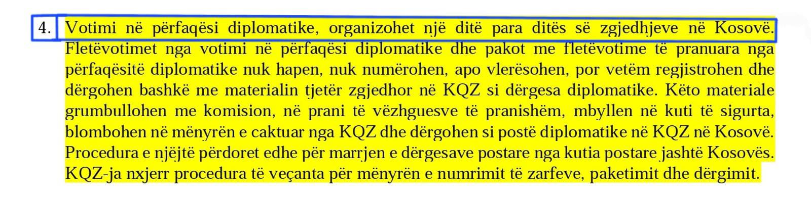 Jo vetëm që e gjithë diaspora nuk do të mundet të votojë Ambasada dhe Konsullata, por edhe ata që do t’iu mundësohet kjo gjë, duhet të votojnë brenda një dite të vetme dhe ajo do të organizohet një ditë para zgjedhjeve në Kosovë.