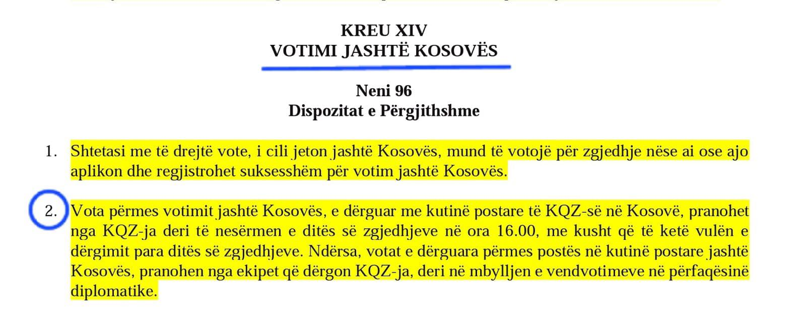 në Kosovë”, specifikohet në pikën 4 të nenit 96 për votimin jashtë Kosovës.