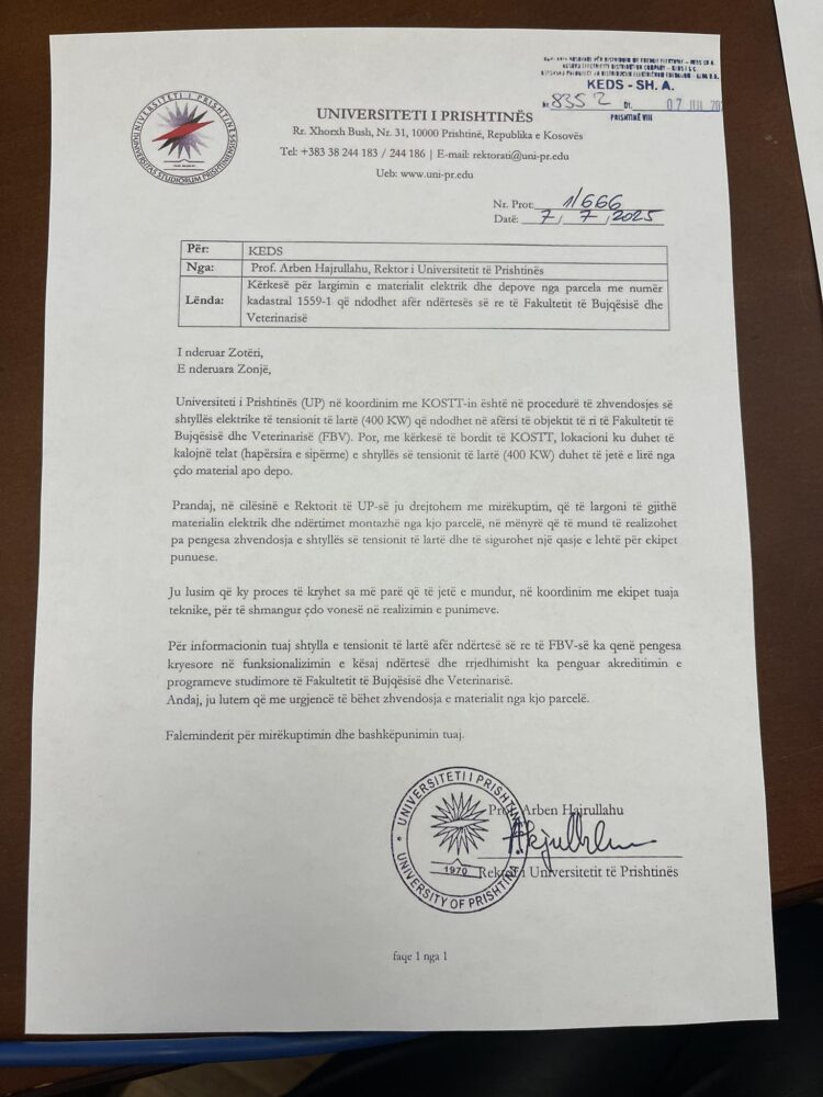 “Kërkesë zyrtare më 7 korrik 2025, ku KEDS-it i kemi kërkuar në mënyrë urgjente që të na mundësojë largimin e telave dhe largpërçuesve. Na ka mbështetur për muri, në shtëpinë tonë. Para dy ditësh kemi dalë me sqarim publik, në të cilin ndër të tjera apelojmë institucionet e Kosovës, si dhe gjithë shoqërinë, që të mos e mbyllin këtë fakultet. Të gjitha strategjitë ndërkombëtare tregojnë për zhvillim ekonomik. Ne na kanë shtyrë për muri dhe fakulteti do të mbyllet; e shihni sa serioze është gjendja. KEDS-i na ka injoruar dhe jemi detyruar t’ua bllokojmë hyrjen në depon e tyre ilegale. E kam konsideruar të nevojshme ta njoftoj publikun për cenimin e pronave publike dhe t’iu bëj apel për reflektim dhe zgjidhje të problemit”, tha Hajrullahu.