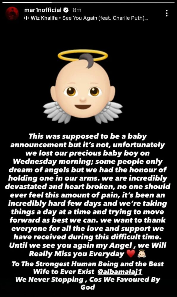 “Dua t’i falënderoj të gjithë për dashurinë dhe mbështetjen që na keni dhënë në këtë kohë të errët. Derisa të shihemi sërish, engjëlli im, do të na mungosh çdo ditë. Për njeriun më të fortë dhe gruan më të mrekullueshme që ka ekzistuar ndonjëherë, Alba – ne nuk ndalemi kurrë, sepse jemi të bekuar nga Zoti”, përfundonte shkrimi.