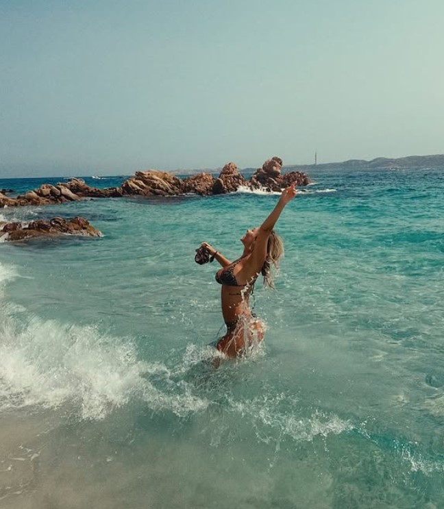 Në një prej fotografive, ajo shihet në det me bikini, duke shijuar ujin kristal të kaltër dhe rrezet e diellit.