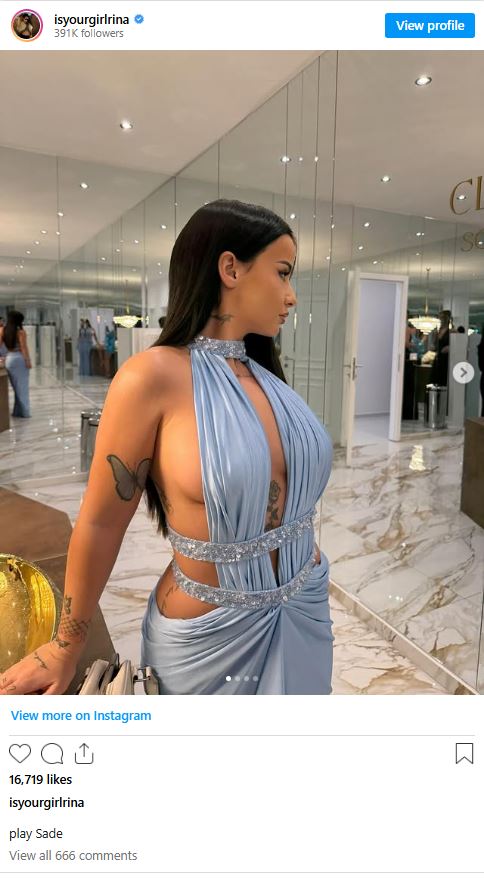 Në fotografitë e fundit, Rina është shfaqur e veshur me një fustan blu.