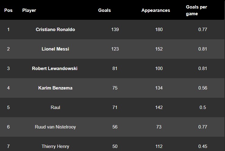 Lewa tashmë numëron 81 gola, dhe këtë edicion është golashënuesi më i mirë me tetë finalizime, derisa Benzema numëron 75 gola.