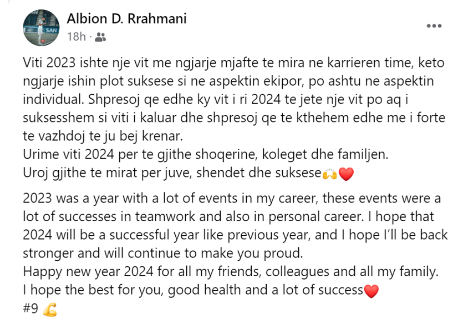 Më poshtë mund ta lexoni postimin e futbollistit llapjan, i cili synon ta japë kontributin e tij tek Rapid Bukureshti në pjesën e dytë të sezonit dhe më pas, qoftë në verën që vjen apo në vitin 2025, ta gjejë një angazhim në një klub më të madh evropian.