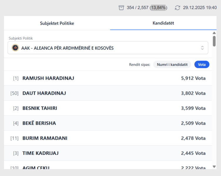 Ndërsa, numërimi i votave të kandidatëve për deputetë ka shkuar në 13,84%, rezultatet preliminare për kandidatët më të votuar të AAK-së janë si në vijim: