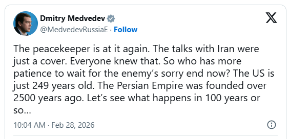 Nënkryetari i Këshillit të Sigurisë së Rusisë dhe ish-presidenti rus, Dmitry Medvedev, ka reaguar pas sulmeve të përbashkëta të ShBA-së dhe Izraelit ndaj Iranit, duke i cilësuar bisedimet e mëparshme mes Uashingtonit dhe Teheranit si “vetëm një mbulesë”.