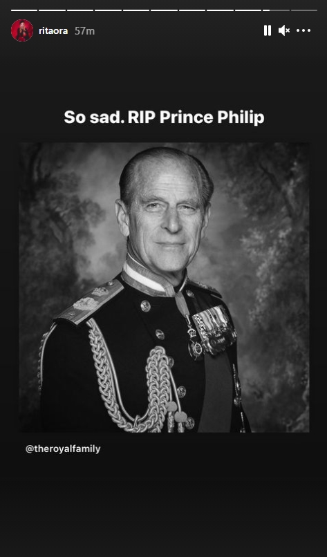 Këngëtarja shqiptare-britanike, Rita Ora, me të parë lajmin, nuk nguroi të shkruante në InstaStory një ngushëllim për princin tashmë të ndjerë.