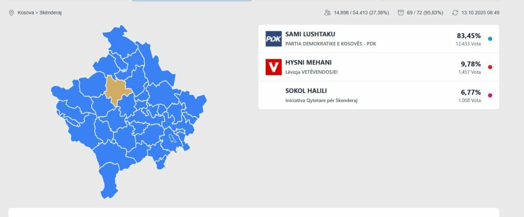 Sami Lushtaku, kandidati i Partisë Demokratike të Kosovës (PDK), ka shënuar një fitore të thellë në zgjedhjet për kryetar të komunës së Skenderajt, të mbajtura më 12 tetor 2025.