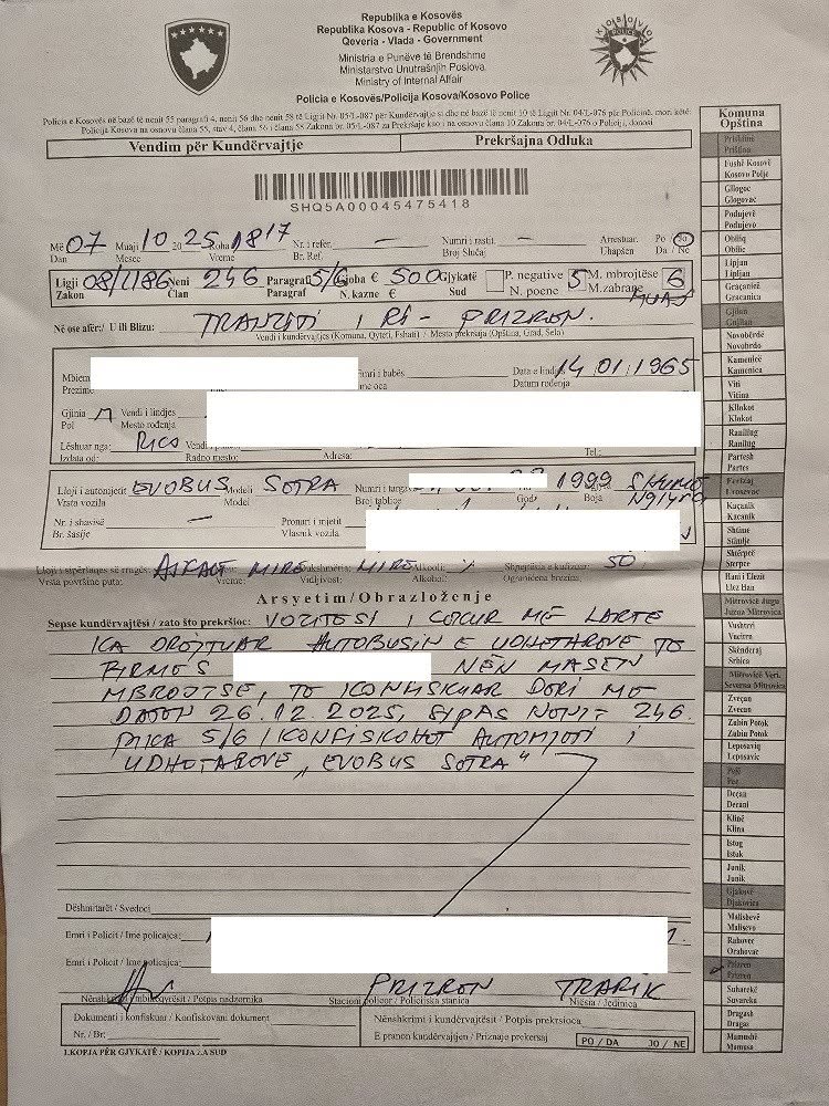 “Në zbatim të Ligjit për Trafikun Rrugor 08/L-186, ndaj tij është shqiptuar fletëparaqitje për kundërvajtje, gjobë prej 500 euro, masë ndalese shtesë prej 6 muajsh dhe 5 pikë negative në patentë. Autobusi është sekuestruar.