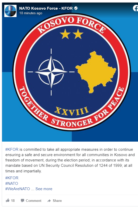 Misioni paqeruajtës i NATO-së në Kosovë, KFOR, ka lëshuar një njoftim për media duke thënë se janë të përkushtuar që t’i marrin të gjitha masat e nevojshme për të siguruar një ambient të sigurt për të gjitha komunitetet në Kosovës dhe për lirinë e lëvizjes, gjatë periudhës zgjedhore.