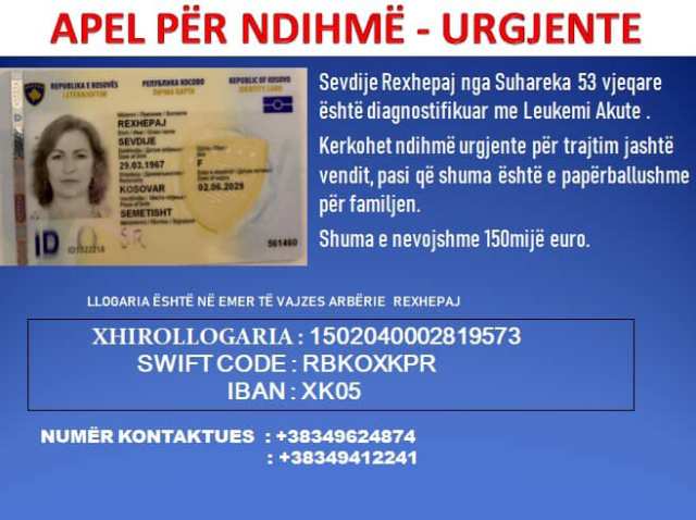 Sevdije Rexhepaj, 54-vjeçare nga Suhareka është diagnostifikuar me Leukemi Akute.