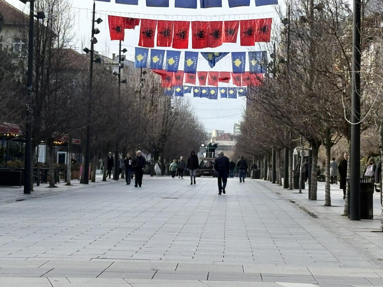 Në 18-vjetorin e shpalljes së Kosovës shtet të pavarur dhe sovran, sheshi i Prishtinës po vendos flamujt e Kosovës por krah tyre edhe flamurin Kombëtar.