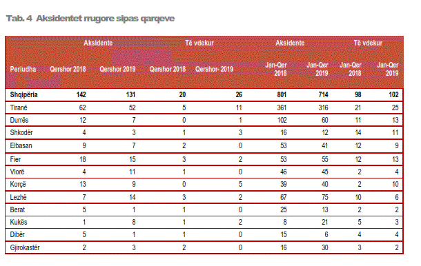 Në Qershor 2019, numri i të aksidentuarve (të vrarë dhe të plagosur) është 187 persona nga 217 që ishte një vit më parë, duke u ulur me 13,8 %. Numri i të aksidentuarve në gjashtëmujorin e parë të vitit 2019, është 960 persona nga 1069 persona, duke u ulur me 10,2 %, krahasuar me të njëjtën periudhë të 2018.
