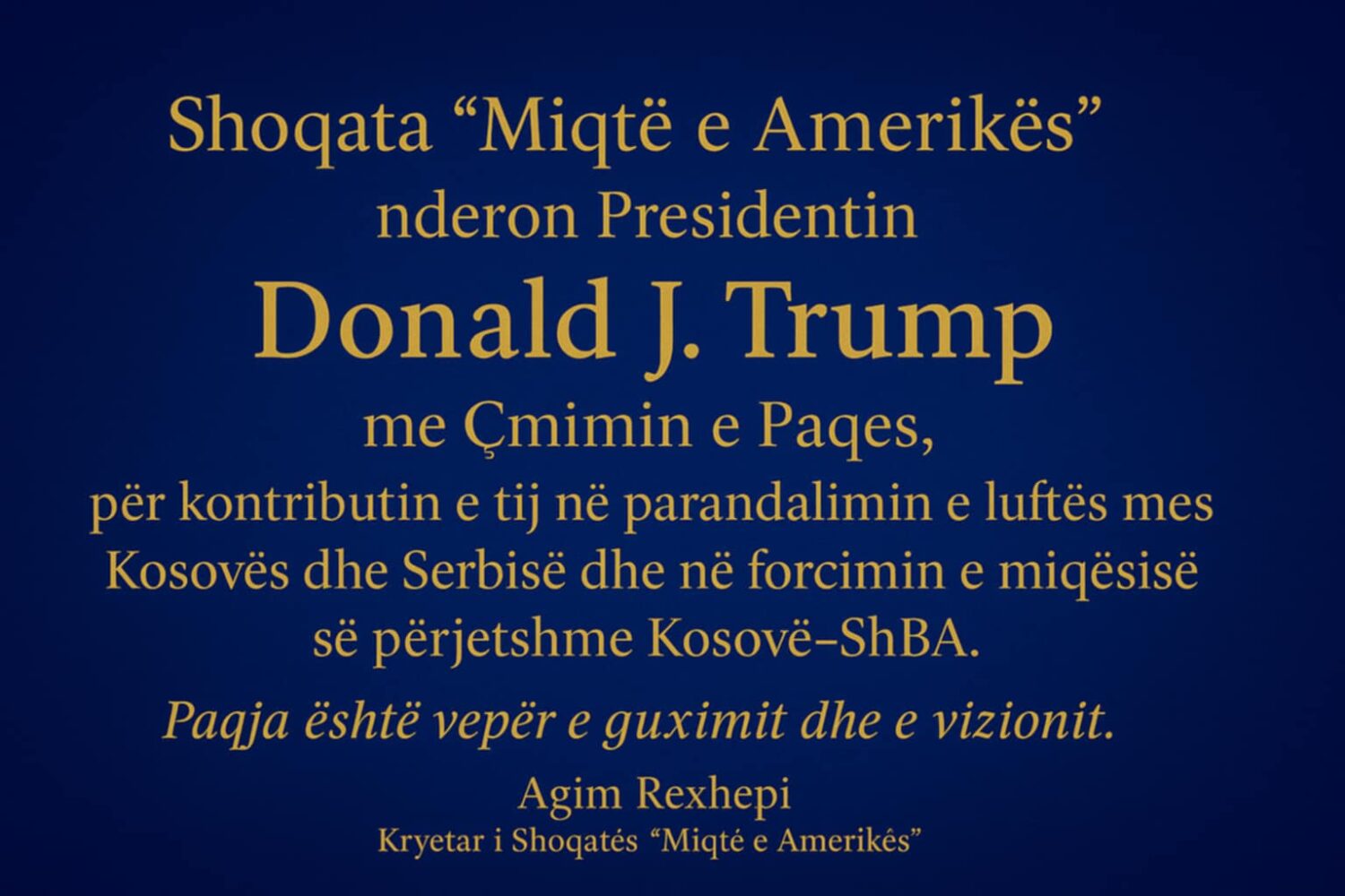 Shoqata “Miqtë e Amerikës” ka nderuar ish-presidentin e Shteteve të Bashkuara të Amerikës, Donald J. Trump, me Çmimin e Paqes, për kontributin e tij në parandalimin e një konflikti të mundshëm mes Kosovës dhe Serbisë dhe në forcimin e marrëdhënieve të përjetshme Kosovë–ShBA.