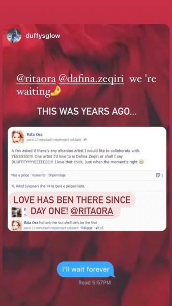 Ata i kanë dërguar një status të artistes së njohur me famë botërore Rita Ora e cila ka shkruar se një nga këngëtarët shqiptarë që ajo dëshiron të realizoj një bashkëpunim është Dafina.