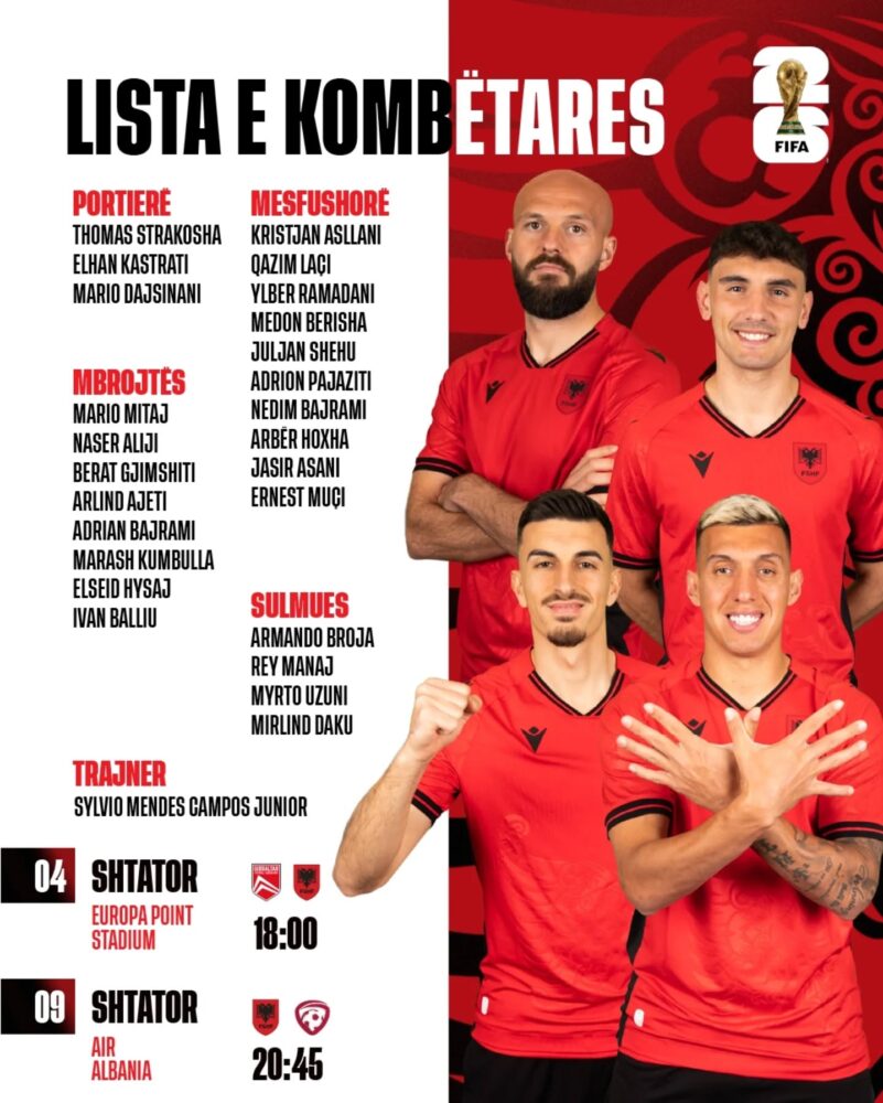 Më 4 shtator Shqipëria luan miqësore ndaj Gjibraltarit, kurse më 9 shtator në “Air Albania” kundër Letonisë për kualifikim në Kupën e Botës 2026.