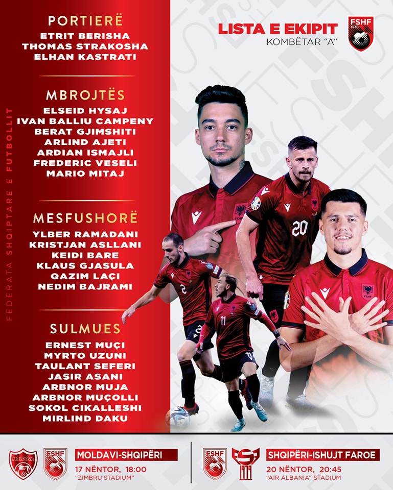 Shqipëria ka publikuar listën e lojtarëve për dy ndeshjet e fazës kualifikuese të Kampionatit Evropian.