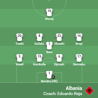 Trajneri i Shqipërisë Edoardo Reja ka vendosur të luajë me skemën 4-1-4-1, me Rey Manaj i vetëm në sulm.