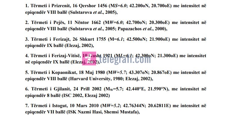 Në raportin “Mikrozonimi Sizmik i Gjilanit”, i cili është hartuar nga Ministria e Zhvillimit Ekonomik, thuhet se janë shtatë tërmete më të fuqishme që e kanë goditur Kosovën.