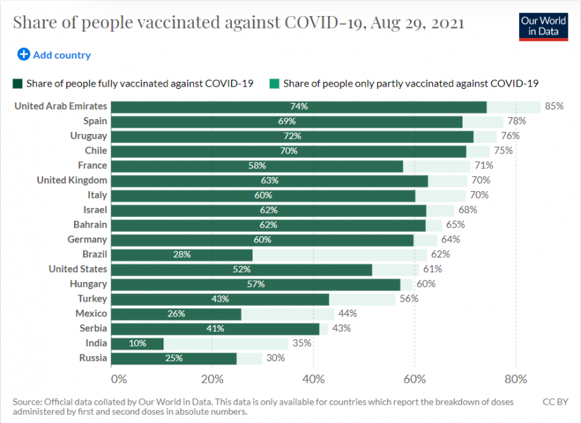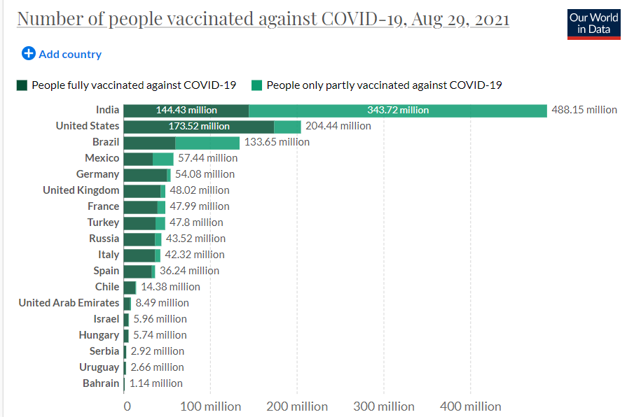 India është shteti i parë në botë që ka injektuar më shumë doza vaksinash, 488.14 milionë doza. Nga këto, 144.43 milionë qytetarë janë vaksinuar më të dyja dozat dhe 343.72 milionë kanë marrë vetëm një dozë. Pas Indisë renditen Shtetet e Bashkuara të Amerikës, Brazili, Meksika, Gjermania dhe një sërë shtetesh të tjera. Ndërsa, vaksinime në raport me popullsinë kanë kryer më shumë Emiratet e Bashkuara. Ky shtet ka vaksinuar me të dyja doza 74% të popullsisë dhe 11% me një dozë të vetme. Pas Emirateve të Bashkuara renditet Spanja, Uruguai, Kili, Franca, Mbretëria e Bashkuara dhe Italia.