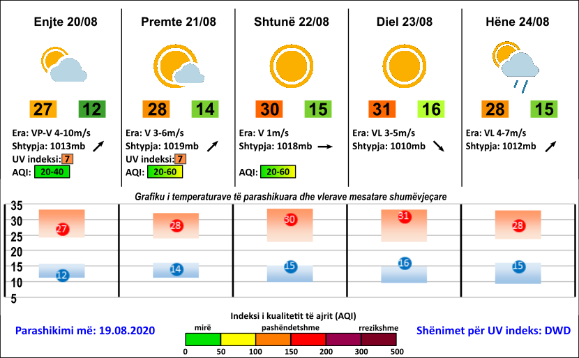 20.08 – Në mëngjes më freskët, përgjatë viseve të ulëta mundësi për mjegull/mjegullinë. Ditën pjesërisht vranët. Në mbrëmje kthjellime.