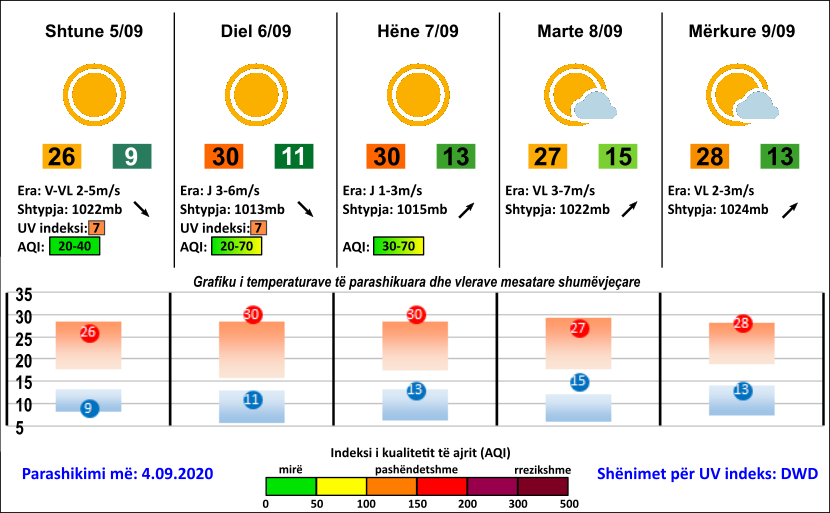 Temperaturat minimale do të lëvizin nga 9C deri në 15C, ndërsa maksimalet nga 26C deri në 30C.