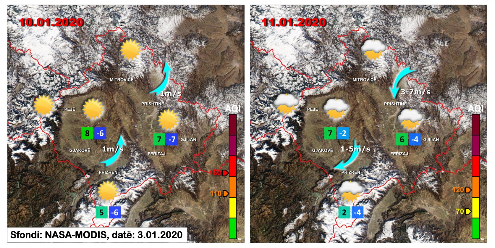 11.01.2020 – Kryesisht me vranësira dhe intervale me diell. Në mëngjes ngrica. Pasdite dhe në mbrëmje, mundësi për riga lokale shiu, e në vise malore mund të priten edhe reshje bore. Erë e lehtë dhe mesatare nga verilindja 1-7m/s. Indeksi UV: 1.