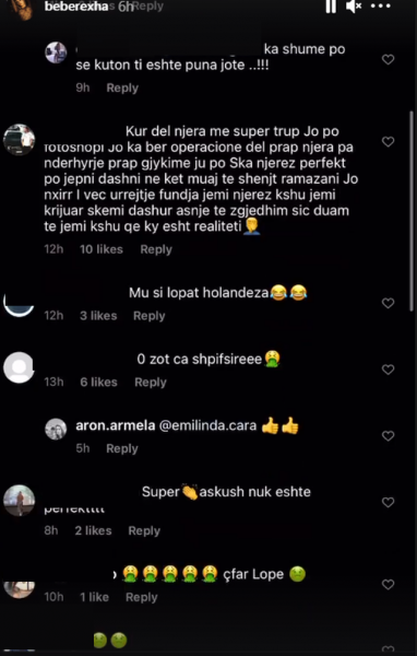 Videon në fjalë e ka publikuar edhe një faqe shqiptare në “Instagram”, ku komentet negative të tipit “si lopë” apo “e shpifur”, i kanë rënë menjëherë në sy Bebe Rexhës, e kjo e fundit i ka ndarë këto komente në “Instastory”-n e saj.
