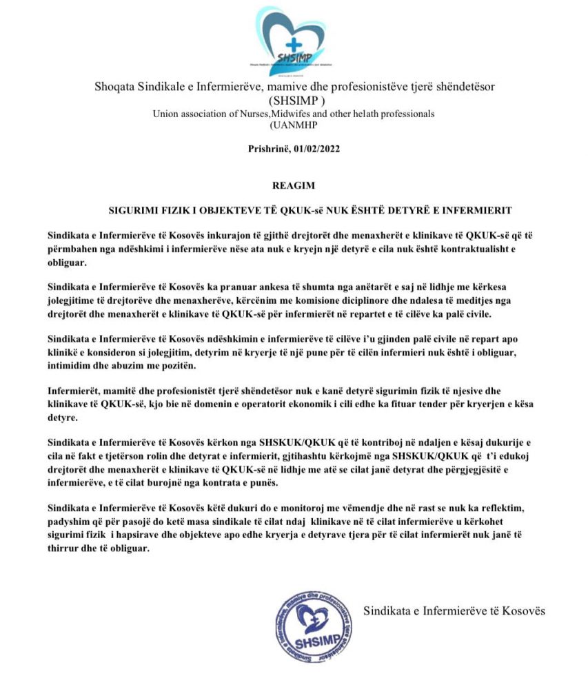 Infermierët, mamitë dhe profesionistët tjerë shëndetësor nuk e kanë detyrë sigurimin fizik të njesive dhe klinikave të QKUK-së, kjo bie në domenin e operatorit ekonomik i cili edhe ka fituar tender për kryerjen e kësa detyre.