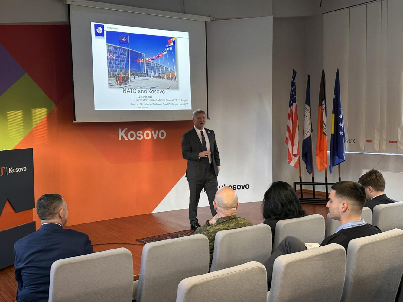Studentët e fakultetit amerikan RIT Kosovo (A.U.K) kanë mbajtur një ligjeratë me ish-kolonelin amerikan, Philippe Roggers i cili ka treguar ekspericën e tij gjatë luftës së fundit në Kosovë, raporton Ekonomia Online.
