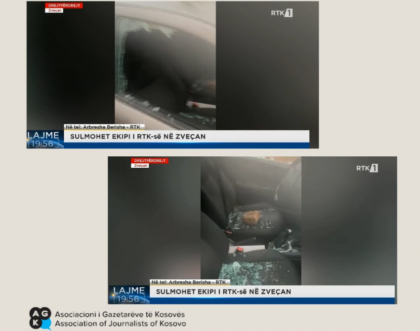 Në Zveçan sonte u sulmua vetura e ekipit të Transmetuesit Publik, Radio Televizionit të Kosovës – RTK, e përbërë nga gazetarja Arbresha Berisha, kameramanët Ilir Uka dhe Bardh Bekteshi, si dhe inxhinieri, Mentor Vinarci.