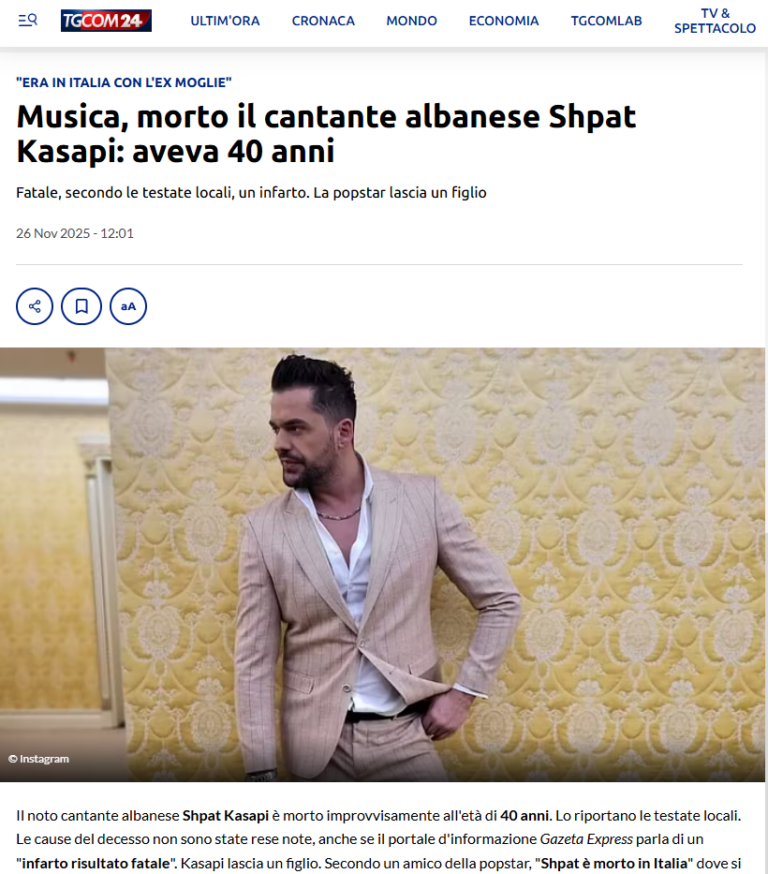 Mediat zvicrane dhe italiane kanë raportuar për vdekjen e këngëtarit të njohur, Shpat Kasapi. Kasapi ka vdekur në moshën 40-vjeçare, pas një ataku kardiak.
