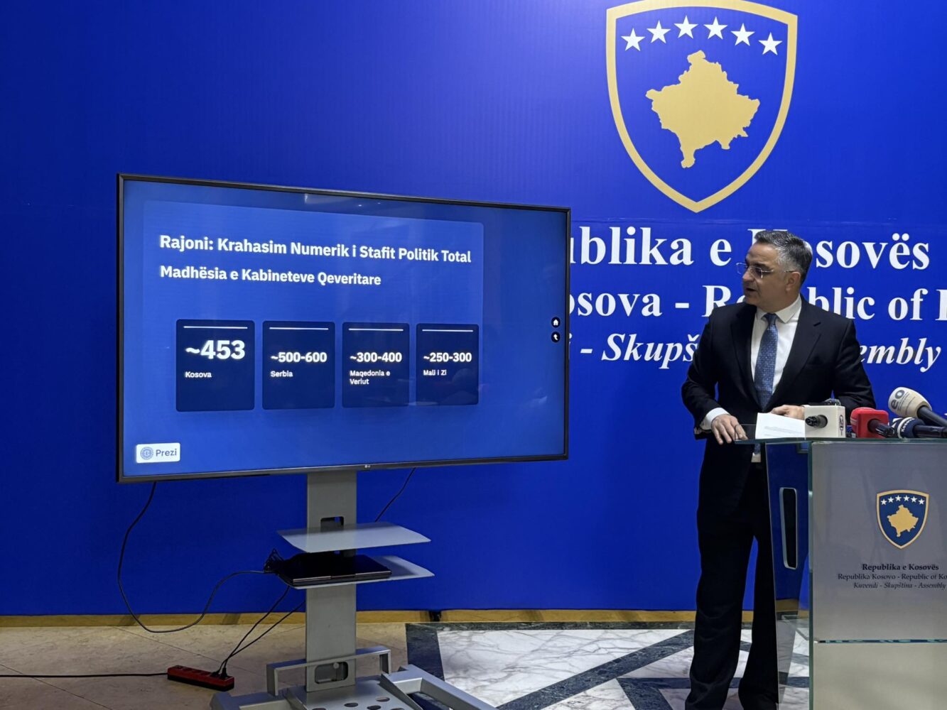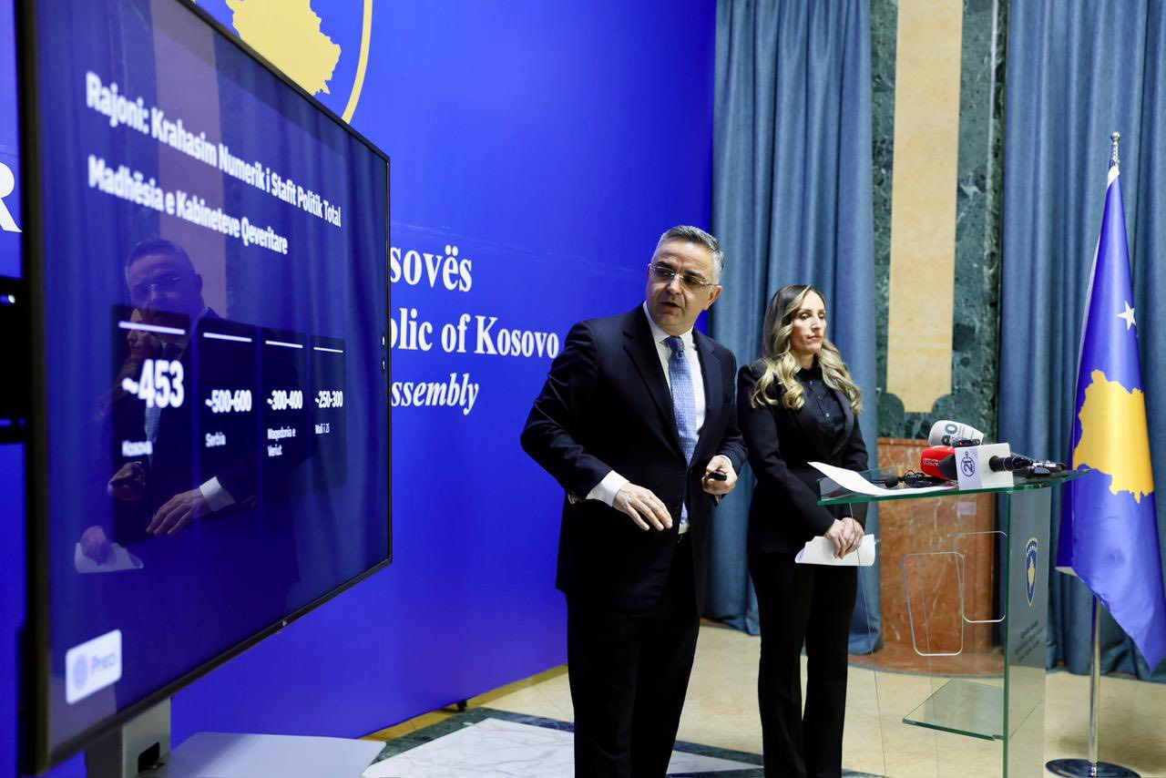 “Po flasim për madhësinë e qeverisë, e cila mos asgjë tjetër përshkruan një qeveri totalisht fiktive, ministri fiktive dhe akomodim të partisë në pushtet në qeveri. Me një kabinet i cili është një ndër më të mëdhenjtë në Ballkanin Perëndimor, ndërsa në krahasim me numrin e popullatës është padyshim më i madh se i Kinës, se i Indisë, se i Pakistanit. Dhe tani më lejoni të paraqes para jush analizën tonë. Prej ku buron kjo analizë? Qeveria e Republikës së Kosovës ka miratuar rregulloren e saj me numër 04/2026, ku ka prezantuar strukturën e ministrive, anëtarët e kabinetit dhe mbi të gjitha ka krijuar ministri të cilat nuk kanë portofol real, po kanë portofol fiktiv me qëllimin e vetëm për të rritur numrin e ministrive, për të pasur sa më shumë staf të emëruar politik dhe në të njëjtën kohë për të akomoduar agjendën e tyre partiake. Kur e shohim këtë rregullore, e shohim po ashtu një ndarje e cila nuk reflekton sot nevojën e Kosovës. Po më lejoni të bëj një prezantim para jush: kjo është analiza e strukturës së kabineteve qeveritare, e cila kur e shohim kornizën ligjore, flasim kështu: Kryeministri: Ka deri 24 këshilltarë politikë, prej tyre 10 të jashtëm dhe 15 staf. Zëvendëskryeministrat: Kanë 8 deri në 11 këshilltarë, prej tyre janë pesë të jashtëm dhe gjashtë staf brenda kabineteve të veta. Ministrat: Kanë deri në shtatë këshilltarë politikë, tre të jashtëm dhe katër staf. Zëvendësministrat pa portofol: (Pra që nuk ekzistojnë ministrat që kanë ministri, pra ata që janë pa portofol) kanë deri në dy staf. Supozimi analitik është ky: 19 ministri dhe minimum dy zëvendësministra për ministri, që përbëjnë gjithsej 38. Kjo është struktura bazë ku paraqitet numri i pozicioneve kryesore në qeveri: normal është kryeministri, tre zëvendëskryeministra, 19 ministrat, 38 zëvendësministra, shikoni, 57 anëtarë të stafit politik”, tha ai.