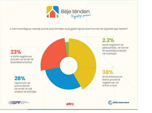 Sipas rezultateve të anketës, rreth 38% të të anketuarve kishin pronë të regjistruar në emrin e tyre, ndërsa 28% raportuan se prona është në emër të një anëtari të familjes. Për më tepër, 23% e kanë regjistruar pronën në emër të bashkëshortit/tes, dhe vetëm 2.2% kanë regjistrim të përbashkët, në formë të bashkëpronësisë në martesë. Gjatë vizitave në familje, vullnetarët kanë shpërndarë broshura informuese mbi të drejtat pronësore si dhe hapat e nevojshëm për legalizim dhe regjistrim të pronave. Kliko për më shumë BROSHURËN SHQIP.
