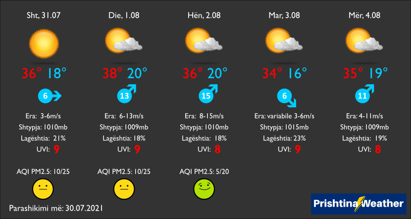 Temperaturat minimale do të luhaten nga 16C deri 20C, e maksimalet luhaten nga 36C deri në 38C, e ditën e martë mund të zbres lehtë deri në 34C.