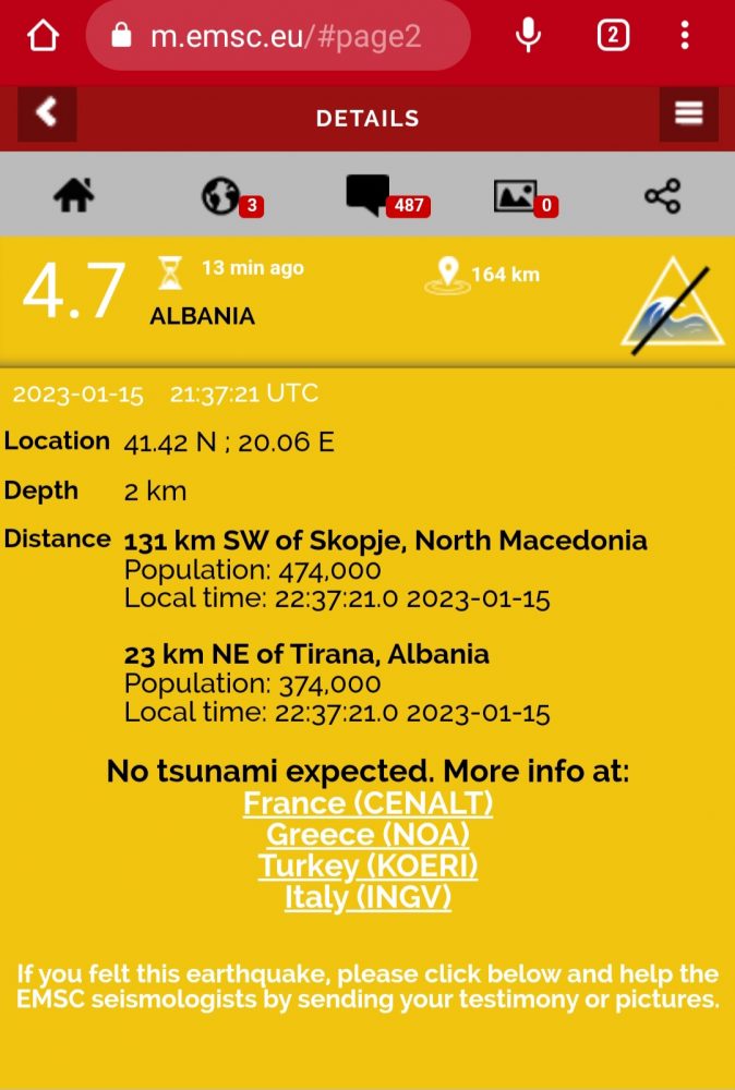 Sipas Qendrës Evropiane Mesdhetare të Tërmeteve (EMSC), tërmeti ka qenë me magnitudë 4.7 ballë të shkallës Rihter.