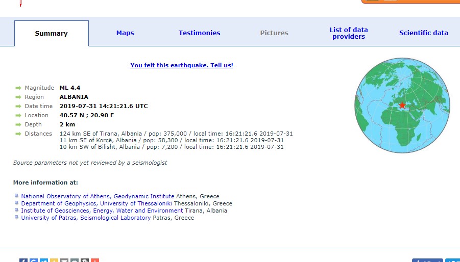 Një tërmet i fortë është ndier në jug- lindje të Shqipërisë. Lëkundjet u ndjenë të forta në Korçë dhe arrijnë një shkallë prej 4.4 ballësh të shkallës Rihter, çka konsiderohet një tërmet mjaft i fortë.