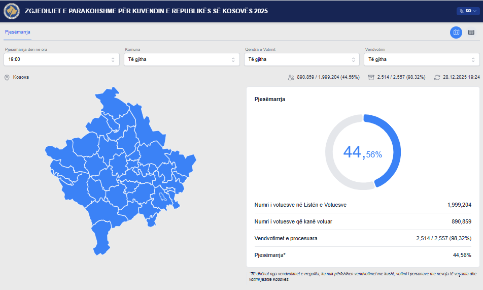 Zgjedhjet parlamentare të 28 dhjetorit kanë hyrë në histori sa i përket daljes së qytetarëve në vendvotimet brenda Kosovës. Sipas procesimit të më shumë se 98.3 për qind të vendvotimeve, të drejtën e votës e kanë shfrytëzuar 890, 859 qytetarë.