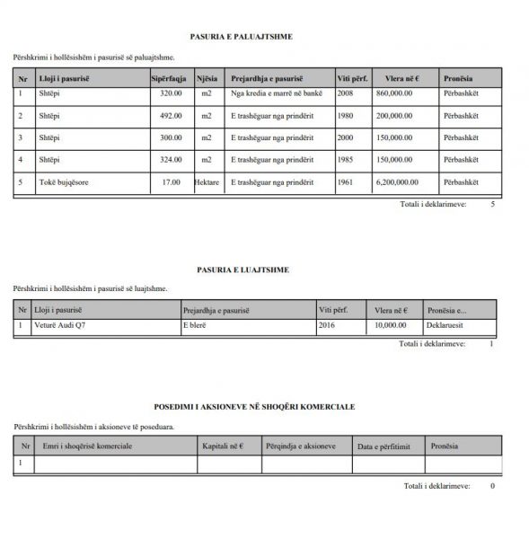 Ai ka edhe detyrime financiare, por edhe para të gatshme. 10 mijë euro është shuma e parave që ai ka kursyer, derisa vlera e kredisë që ai ka marrë për blerjen e shtëpisë është 450 mijë euro.