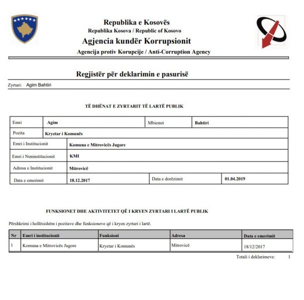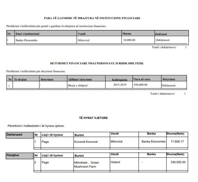 I pari i Komunës së Mitrovicës në Agjencinë Kundërr Korrupsionit ka deklaruar se ka në pronësi një tokë bujqësore në vlerë prej 6 milionë e 200 mijë euro, të cilën e ka trashëguar nga prindërit. Ai ka në pronësi edhe katër shtëpi të tjera, vlera e të cilave shkon në rmë shumë se 1 milionë euro.