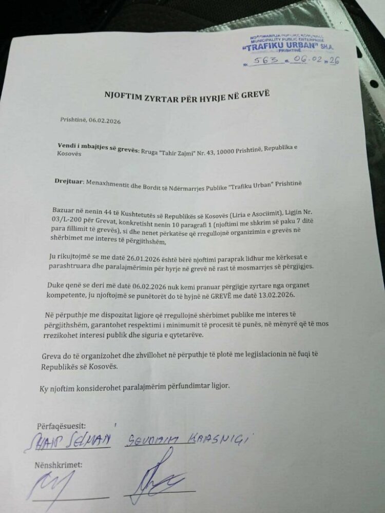 “Bazuar në nenin 44 të Kushtetutës së Republikës së Kosovës (Liria e Asociimit), Ligjin Nr. 03/L-200 për Grevat, konkretisht nenin 10 paragrafi 1 (njoftimi me shkrim së paku 7 ditë para fillimit të grevës), si dhe nenet përkatëse që rregullojnë organizimin e grevës në shërbimet me interes të përgjithshëm. Ju rikujtojmë se me datë 26.01.2026 është bërë njoftimi paraprak lidhur me kërkesat e parashtruara dhe paralajmërimin për hyrje në grevë në rast të mosmarrjes së përgjigjes. Duke qenë se deri më datë 06.02.2026 nuk kemi pranuar përgjigje zyrtare nga organet kompetente, ju njoftojmë se punëtorët do të hyjnë në Grevë me datë 13.02.2026. Në përputhje me dispozitat ligjore që rregullojnë shërbimet publike me interes të përgjithshëm, garantohet respektimi i minimumit të procesit të punës, në mënyrë që të mos rrezikohet interesi publik dhe siguria e qytetarëve”, thuhet në njoftimin e tyre.