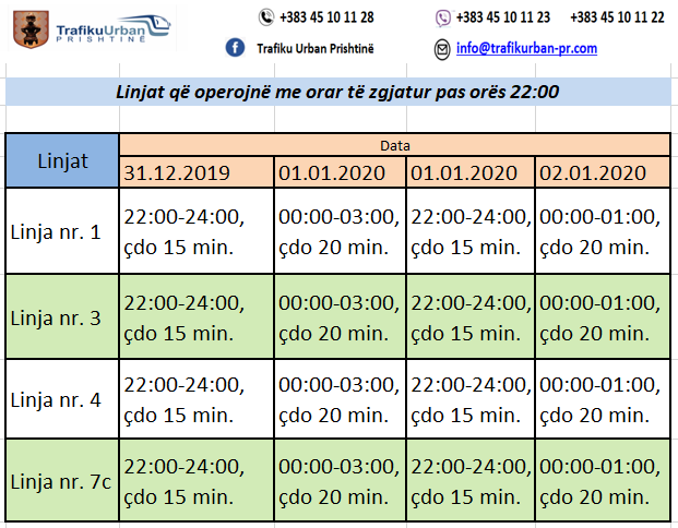 “Njoftohen qytetarët se në mbrëmjen e dt.31 dhjetor, autobusët e linjave 1, 3, 4 dhe 7C, pas përfundimit të orarit të rregullt do të vazhdojnë deri në mëngjesin e dt. 1 janar – deri në ora 03:00. Te gjitha informatat janë përfshirë në tabelën e publikuar në vijim dhe gjithashtu në dispozicion janë koordinatorët e qarkullimit të cilët ofrojnë informata të drejtpërdrejta në çdo kohë përmes telefonave: 045 10 11 22; 045 10 11 23; 045 10 11 28”, thuhet në njoftim.