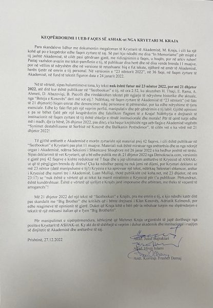 “Në versionin e “23 nëntorit 2022”, në 36 faqe, në faqen zyrtare të Akademisë, në fund të tekstit figuron data e 24 janarit 2022. Në të vërtetë, sipas hulumtimeve tona, ky tekst nuk është futur më 23 nëntor 2022, por më 21 dhjetor 2022, atë ditë kur është publikuar në “facebookun” e tij, në ora 2:52, ku akuzohen H. Thaçi, E. Rama, A. Ahmeti, D. Abazoviqi, B. Pacolli dhe riredaktohen tekstet për ngjarje të ndryshme historike dhe aktuale, nga “Beteja e Kosovës” deri më sot etj.! Ndërkaq, në faqen zyrtare të Akademisë të “23 nëntorit” (në fakt të 21 dhjetorit) hiqen emrat dhe denoncimet ndaj personave të përmendur, por ka edhe ndryshime të tjera esenciale”, thuhet në reagim, duke shtuar se këto fakte flasin për qëndrimet labile të kryeakademikut.