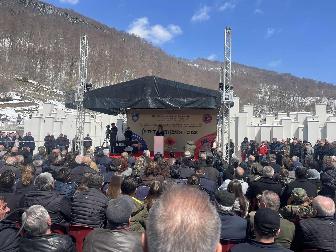 “Është nder të bashkohemi në vendin, ku ruhet historia jonë, ku dëshmohet historia jonë, në vendin ku pushojnë heronjtë tanë, të kombit tonë. Të gjithë ju që qëndroni në këtë vend e ndieni se sa e vështirë është rruga jonë e lirisë dhe se si erdhëm këtu. Një mënyrë ndryshe të shpjegojmë këtë është të shpjegojmë figurat e para që kujtojmë, nëse marrim Agim Ramadanin, një shqiptar intelekual, patriot; Salih Çeku, po ashtu njeri me vizion; nëse marrim Xhemajl Fetahun shohim familje tradicionale, patriot. Këto tri shtylla i gjeni te të gjitha këta që kujtojmë sot. A ka mënyrë tjetër të shpjegohet kjo ditë? Janë thyer mitet, u thye edhe miti më i keq: ajo që ndante zemrat tona, kufirin shqiptaro – shqiptar. Në pak ditë luftë u vra një numër kaq i madh i luftëtarëve. Në këtë ditë ne vërtet e ndiejmë një krenari se me këtë ditë u bashkua edhe Kushtetuta e shtetit tonë. Gëzuar Dita e Kushtetutës… Një mësim nga e shkuara nuk bën te harrohet kurrë: të krijojmë aleanca të sigurisë. Është e arritur e madhe dhe nëse dimë t’i ruajmë e forcojmë këto aleanca nuk përseritet historia dhe nëse mbesim jashtë, mund që historia të kthehet”, tha Haradinaj.