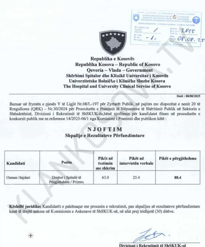 Osman Hajdari, ish-ushtruesi i detyrës së drejtorit të Qendrës Klinike Universitare është zjgedhur drejtor I Përgjithshëm I Spitalit të Prizrenit.