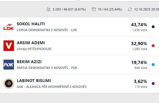 Në garën për ta marrë drejtimin e Vitisë është duke udhëhequr Sokol Haliti i Lidhjes Demokratike të Kosovës me 1 mijë e 436 vota.