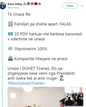 Nëpërmjet disa reagimeve në rrjetet sociale, kryebashkiaku Veliaj thekson se Unaza e Re i duhet Tiranës dhe se institucionet kanë ofruar strehim falas për ata që janë të pastrehë dhe shpronësim qind për qind për atë që i kanë pronat me letra,
